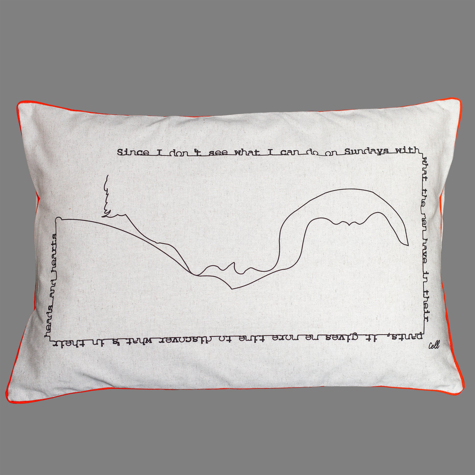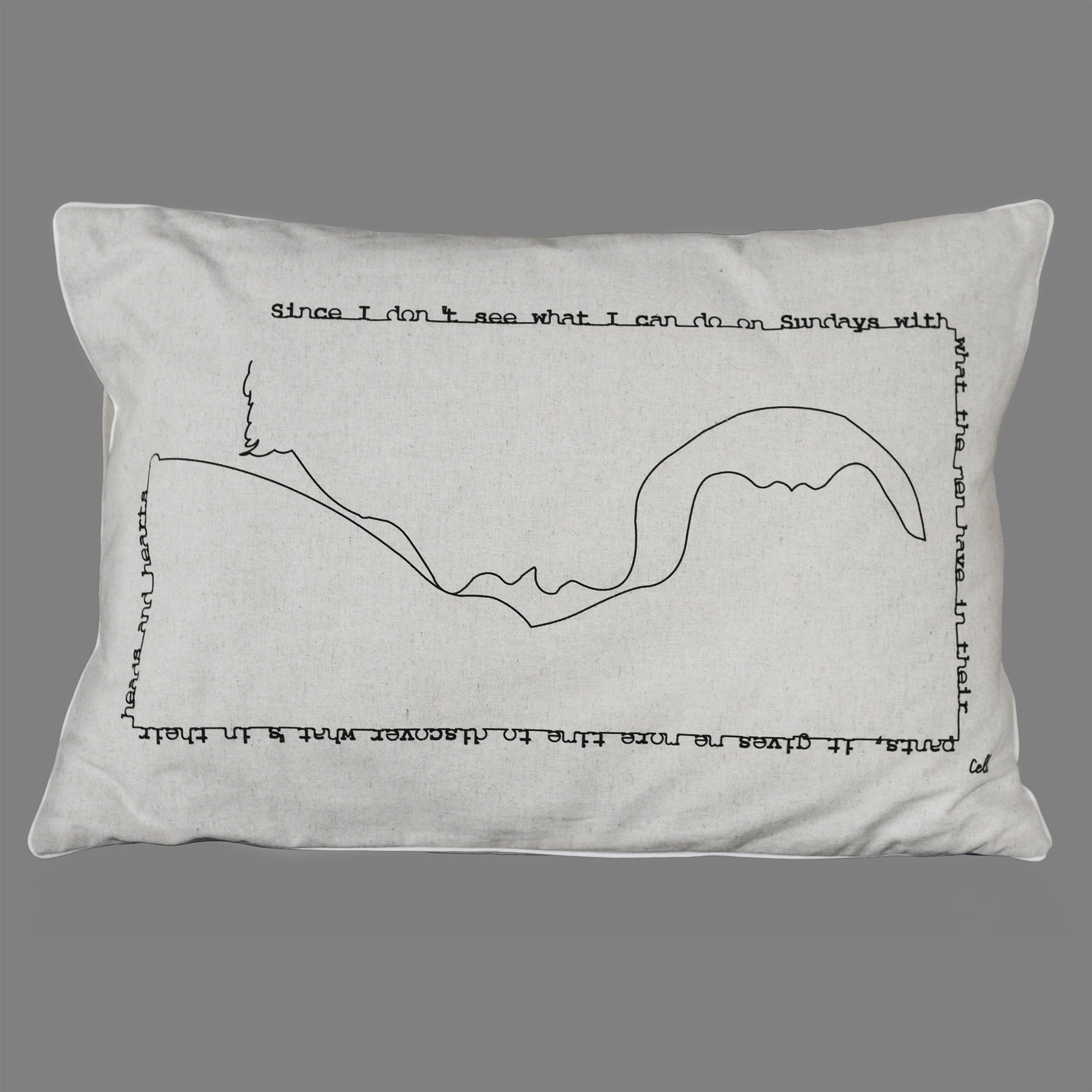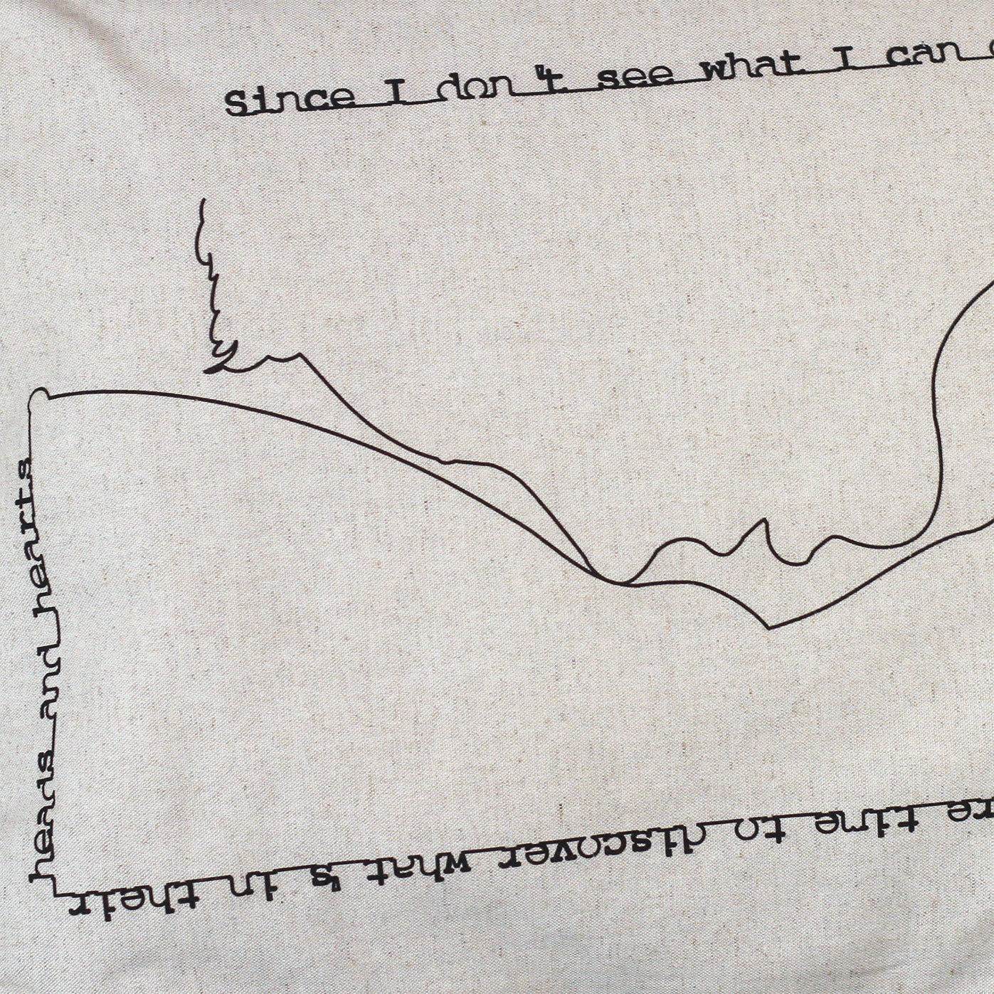 Deux visages féminins, tête-bêche, se cherchent et se trouvent dans un baiser tendre. Leur ligne continue se poursuit dans une phrase-cadre :