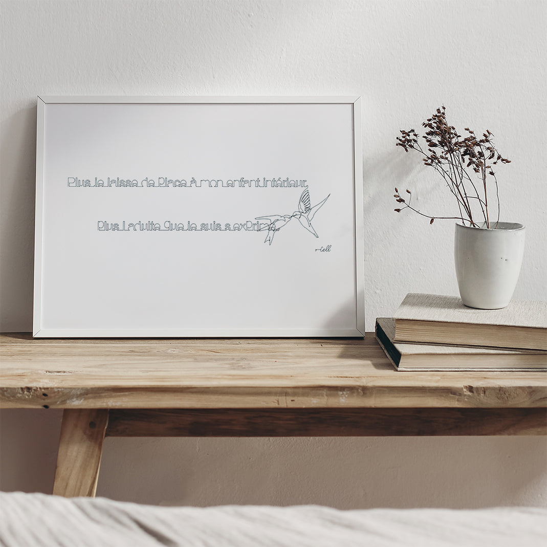 Une ligne continue mêlant la phrase « Plus je laisse de place à mon enfant intérieur, plus l’adulte que je suis s’exprime » et un couple d’hirondelles qui s’embrasse. Né d’un désir de réconcilier l’innocence et la maturité, ce dessin murmure un message subtil : en prenant soin de son enfant intérieur, l’adulte s'incarne véritablement, et trouve par ricochet force, clarté et légèreté.